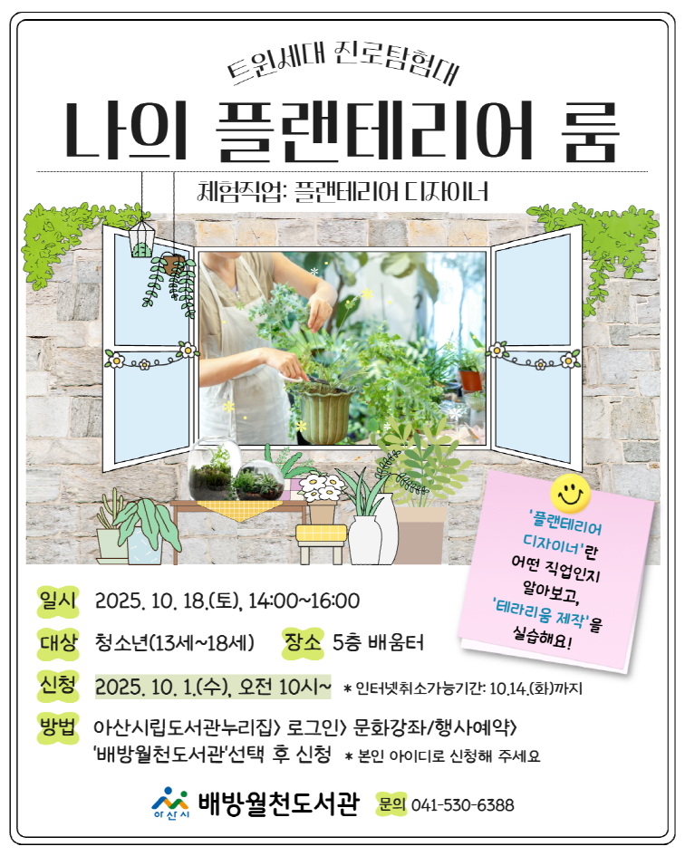 "플랜테리어 디자이너"란 직업을 들어봤나요? 빛, 공기, 공간, 취향을 고려하여 자연의 빛으로 공간을 디자인 하는 전문가, 플랜테리어 디자이너에 대해 알아보고, 테라리움 제작을 실습해 봅니다. 전문가와 함께하는 트윈세대 진로탐험대! 많은 참여 바랍니다! ※ 수강생 ID로 신청해야 하며, 대상이 아니면 수강 취소됩니다. ※ 수업 당일 취소 및 출석률 70% 이하 미출석자는 경고 처리되며, 3회 누적 시 1년간 아산시립도서관 프로그램 신청이 제한됩니다.