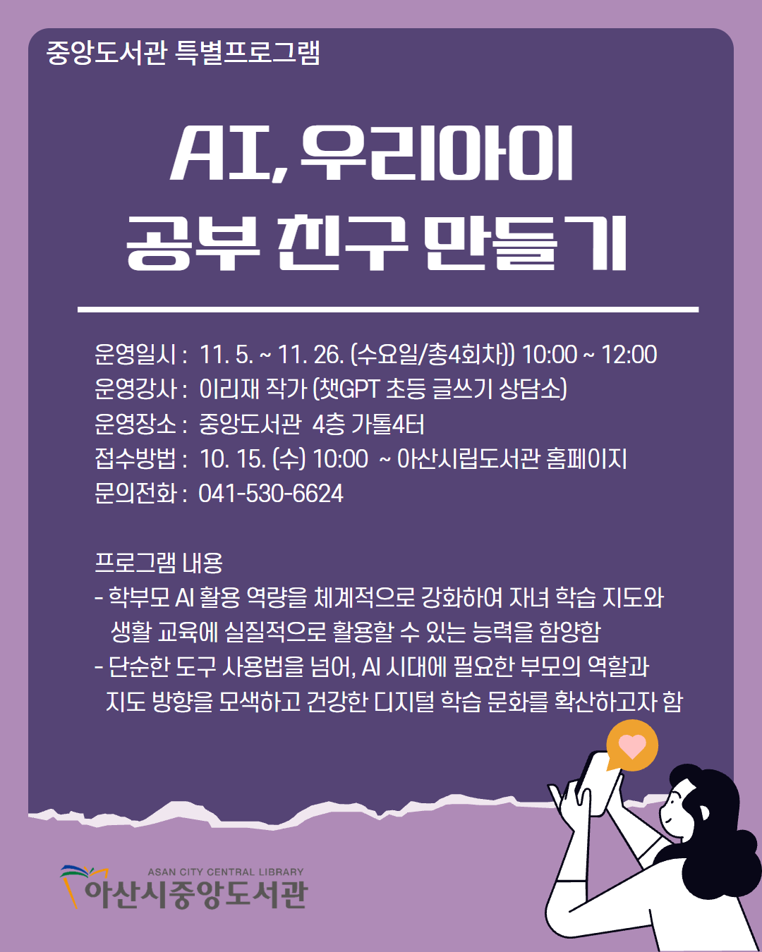 [4회차] AI, 우리아이 공부 친구 만들기 / 2025. 11. 05 ~ 2025. 11. 26 접수중 | ||