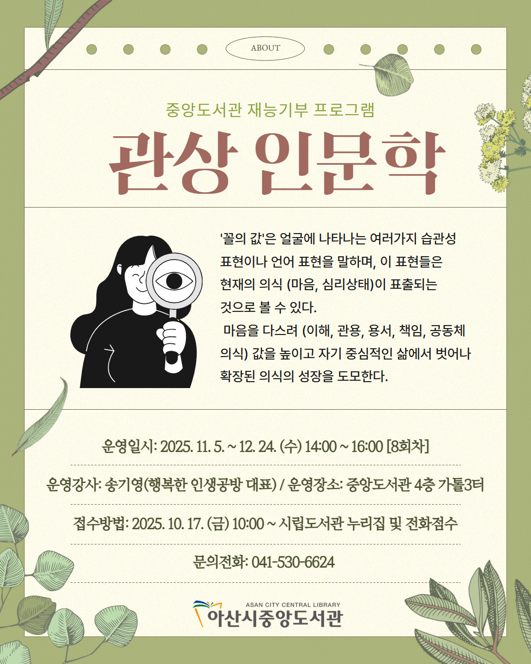 [재능기부] 관상 인문학 (8회차) / 2025. 11. 05 ~ 2025. 12. 24 접수중 | ||||||||||||||||||||