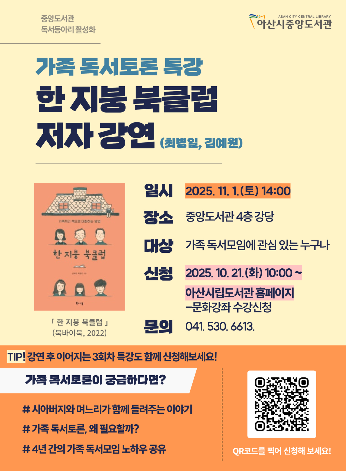 [독서동아리] 가족 독서토론 특강 <한 지붕 북클럽> 저자 강연 / 2025. 11. 01 ~ 2025. 11. 01 ![]() |
